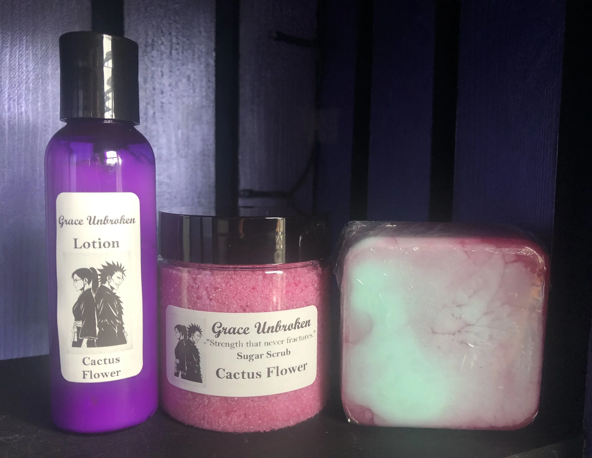 Offered in a Shea Butter soap, Sugar Scrub, and Lotion.
