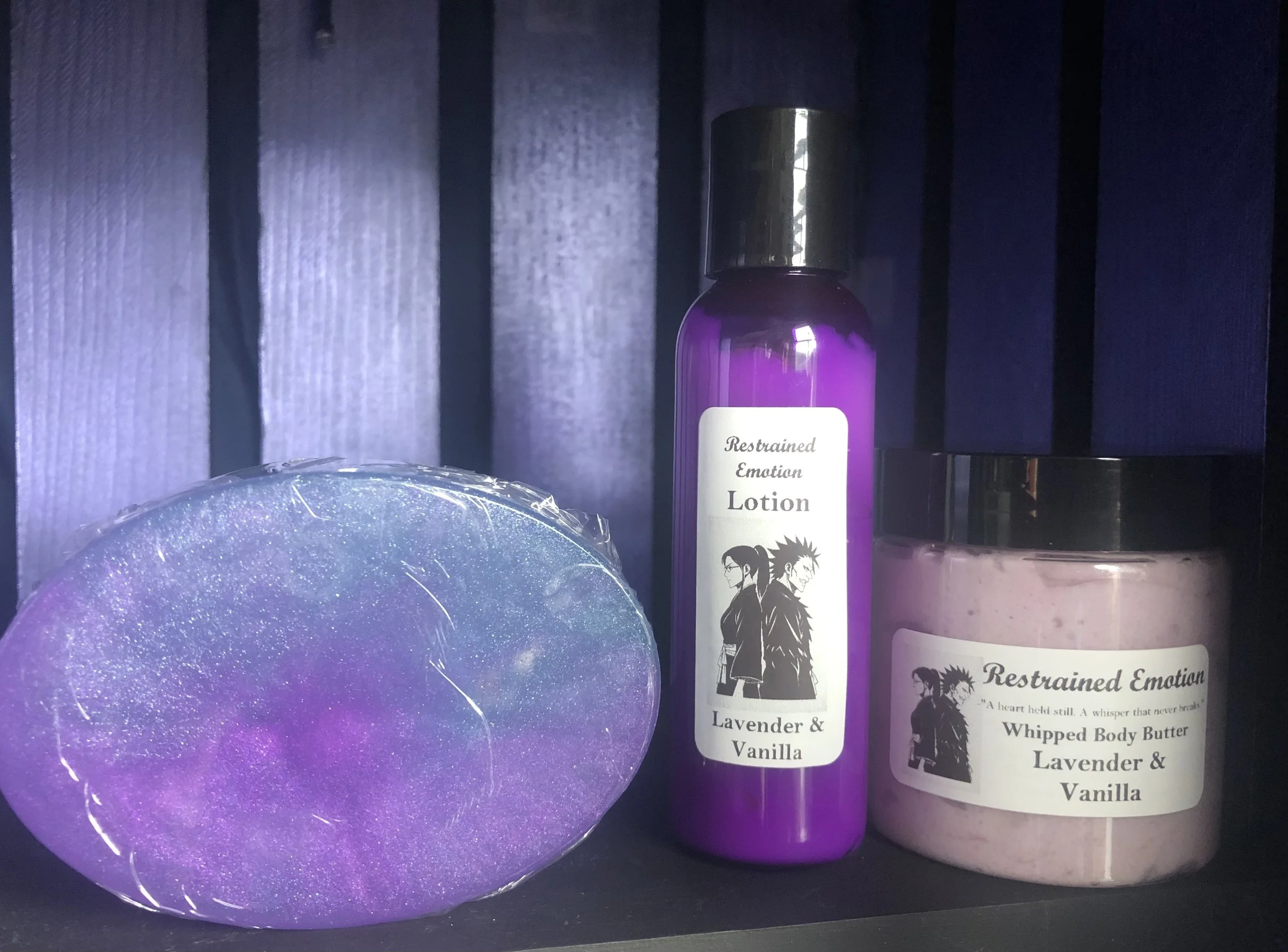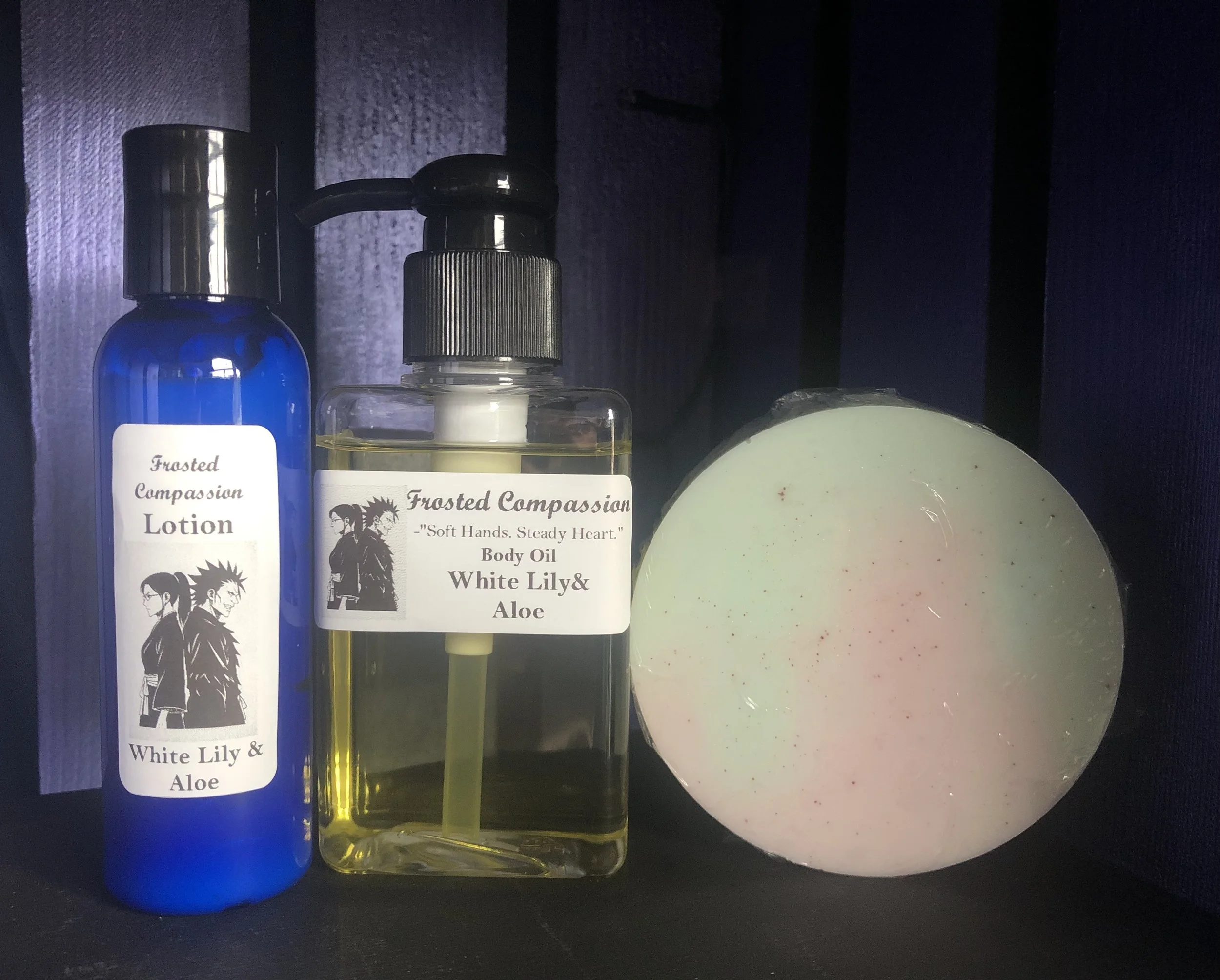 Offered in a Shea Butter soap, Body Oil, and Lotion.